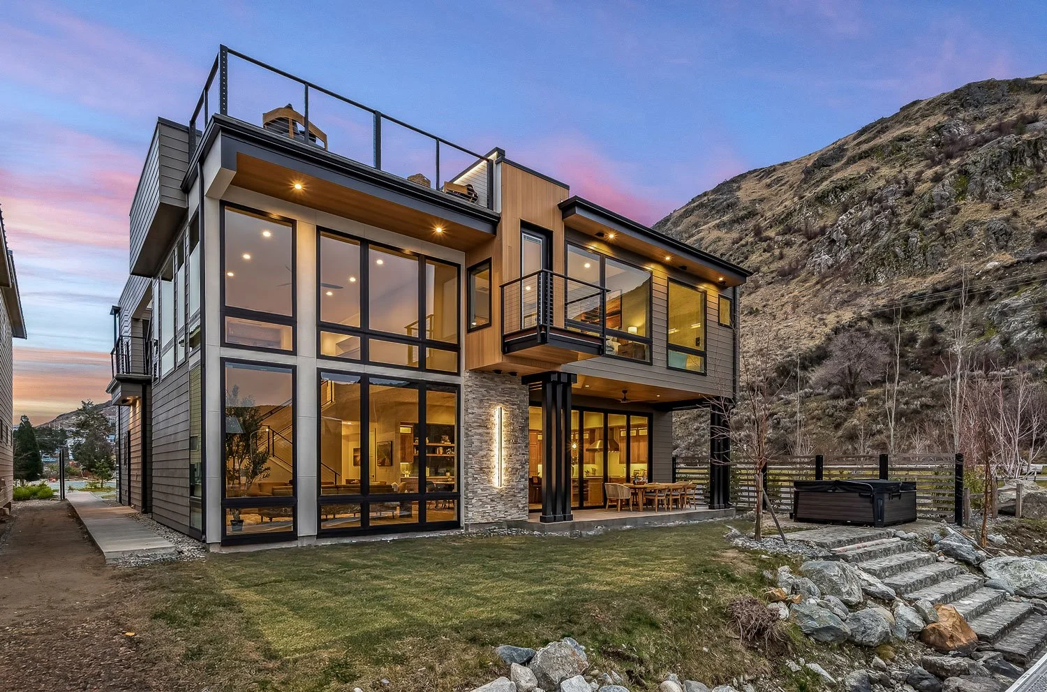A striking modern waterfront home with expansive floor-to-ceiling windows that showcase warm, inviting interiors against a dramatic natural backdrop. Clean architectural lines, layered outdoor spaces, and a rooftop deck create a seamless connection between indoor comfort and the surrounding Chelan landscape.